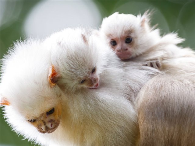 Pygmy marmosets are the smallest of the monkeys and are grow to be a whopping five inches tall and weigh in at half a pound. Living in troops they quickly scurry in the trees with the babies being carried by the dads and then nursed by the moms. Their diet consists of tree sap, which is plentiful in the forest.